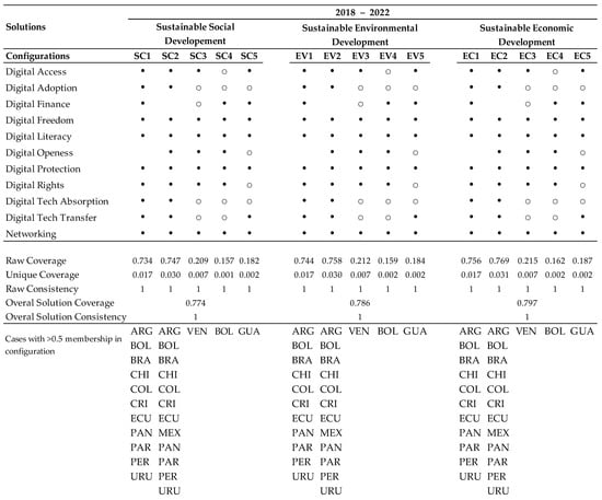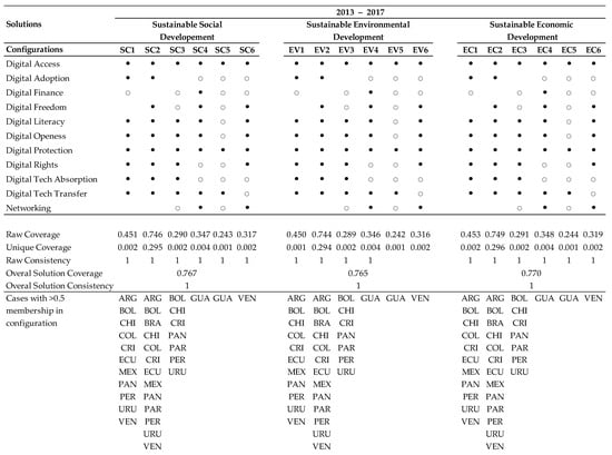 Section 3.1 demonstrated that DEE components impact sustainable social, environmental, and economic development. Here, we propose that a strategic combination of DEE components is equally crucial for developing sustainable development for Latin American countries. We examine whether these countries, at varying stages of SDG development, exhibit distinctive DEE enhancement profiles and how these evolve over time. Our focus is on determining whether countries with similar or different SDG levels have comparable or differing DEE profiles. We aim to identify whether there are more or less effective DEE enhancement profiles within and across different sustainable development levels, investigating whether specific DEE profiles support a transition from lower to higher outcome levels. The findings illustrating how DEE components influence each sustainable development outcome are in Figure 1 for the 2013–2017 period and in Figure 2 for the 2018–2022 period. In Figure 1 and Figure 2, the consistency threshold distinguishes between configurations that are or are not subsets of the outcome [51,59]. Coverage evaluates the extent to which each configuration and the overall solution explain the outcome. Raw coverage measures the proportion of memberships each condition contributes to the outcome, while unique coverage indicates the proportion of cases following the specific configuration leading to the outcome [63].