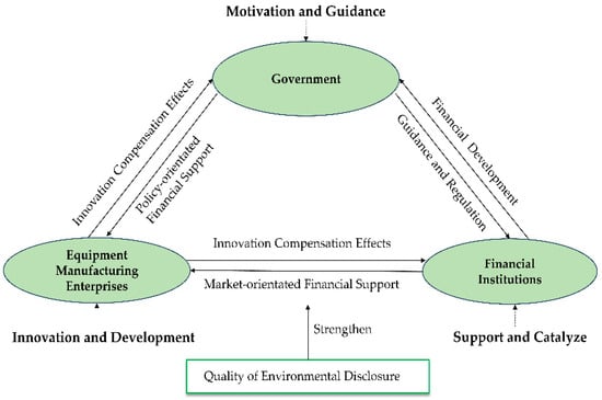 In the system of financial support and GTI, the three main affected parties are equipment-manufacturing enterprises, financial institutions, and the government [33]. The GTI of Chinese equipment-manufacturing enterprises is still in the growth stage, the degree of capital financing is low, and financial support remains an important way for equipment-manufacturing enterprises to overcome financing constraints. Support from financial institutions and the government provides new development opportunities for the GTI of equipment-manufacturing enterprises [34]. The government usually assumes the role of policy-oriented financial support provider, and financial institutions provide market-oriented financial support. Therefore, the game subjects are set as equipment-manufacturing enterprises, financial institutions, and the government. Figure 1 shows the relationship between each game party.