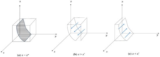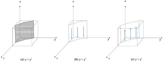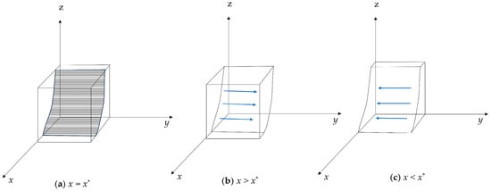 The equilibrium points of the system are E1 (0,0,0), E2 (0,0,1), E3 (0,1,0), E4 (0,1,1), E5 (1,0,0), E6 (1,0,1), E7 (1,1,0), and E8 (1,1,1) from Equation (13). The stability analysis of the eight replicated dynamic system equilibrium points described above is carried out by constructing the Jacobi matrix, which is as follows: