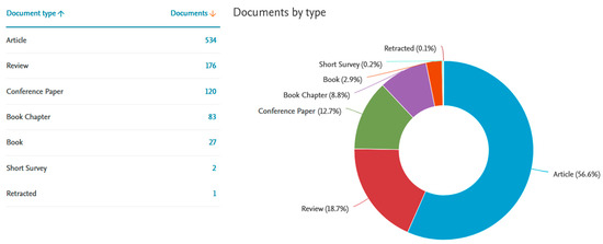 Furthermore, according to the Scopus classification (Figure 3), out of 943 documents, 56.6% represent journal articles, 18.7% are reviews, 12.7% are conference papers, and the rest are book chapters (8.8%), books (2.9%), and short surveys (0.2%). The large percentage of journal articles emphasizes the presence of consolidated studies in the field; on the other hand, the fair number of conference papers demonstrates the vibrancy of the research and provides an insight into possible growth trends.