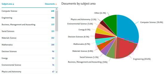 Finally, Figure 5 reveals that there are several research areas that have turned their attention to BCT for data security and traceability in the energy field and with sustainable aspects. Particularly, the most important areas are represented by technical sources: “computer science” (30.4%), “engineering” (20.6%), “business, management and accounting” (7.4%), “social sciences” (5.3%), “material sciences” (4.8%), “mathematics” (4.7%), and “decision sciences” (4.5%). It is important to note that only 4.3% of papers belong to the “energy” subject area, which is the focus of this study.