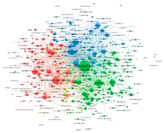 - Cluster 3 (blue) is composed of 149 terms (e.g., application, technology, challenge, development, integration, solution, security, issue, perspective, domain, smart city, combination, requirement, environment, IoT, immutability, technique, use case, decentralization, and ecosystem), and it can be referred to the “blockchain technology for lifecycle management” topic. This cluster focuses on the design, development, and implementation of BCT solutions associated with the use of industrial internet. It also informs the need to build and integrate BCT while considering the specific requirements of use cases and managing all of the potential issues ranging from the conceptualization of the solution to the maintenance and disposal of the technology. Additionally, as the authors of [11,82] explored some applications in specific target areas, the cluster suggests the need to extend the application for generalizable findings [82].
