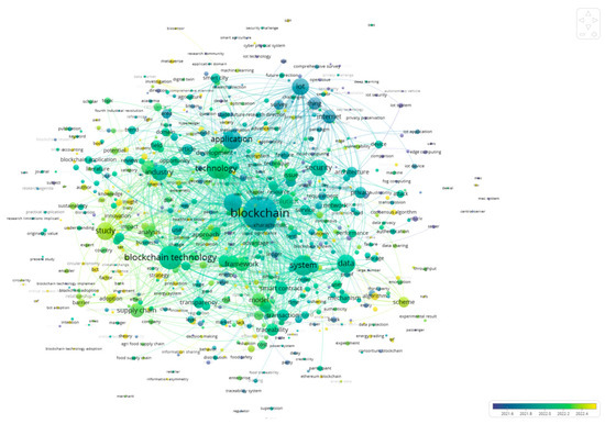Furthermore, Figure 7 shows the overlay visualization of the term co-occurrence. It represents the same network map visualization, but within the temporal dimension, by using different colors (as shown in the color bar in the bottom right corner of the figure). The color represents the average year in which the terms appear. Older terms are in blue, newer terms are in yellow, and terms in the middle are in green. In order to observe a significant difference in colors, the reference time interval is from 2021 to 2023. In fact, before and after these years, no significant differences could be observed. Interestingly, the following main terms appear in recent times: algorithm, energy trading, insights, practice, interoperability, manufacturing, health, artificial intelligence, transition, resilience, behavior, effectiveness, access control, computing, cyber physical system, and investigation. Therefore, recent streams of the considered research fields seem to be focused on the association of BCT with Cyber-Physical Systems (CPSs), artificial intelligence (AI), and other enabling technologies for enhancing the quality of energetic applications.