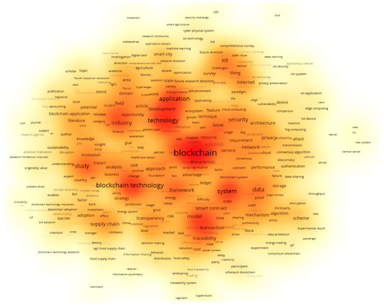 These terms suggest the most important topics in which the scientific literature has been concentrated over the years. It is important to note that, despite the key terms of this study being very considered (i.e., BC, data security and traceability), the terms “energy” and “sustainability” do not appear in the focus of the density distribution, thus suggesting potential future areas of research.