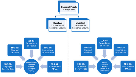 The global economy is confronting a range of sustainability challenges that are impacting nations indiscriminately. Notably, the Asia and Pacific region is facing significant obstacles in advancing towards the attainment of the Sustainable Development Goals (SDGs). The 2021 report by the United Nations Economic and Social Commission for Asia and the Pacific (UNESCAP) revealed that numerous countries within the Asia–Pacific region face formidable barriers to meeting the sustainability targets by the year 2030. These obstacles are multifaceted and comprise social, economic, environmental, and political factors. However, social and economic factors such as human development, social inclusion, and equitable growth opportunities are more important and play significant roles in sustainable economic growth [1]. It has been shown that poverty eradication not only generates a productive workforce by providing them with better access to basic needs, education, and healthcare facilities but also leads toward stable economic development through increased consumer demand [2]. In line with this, equal opportunities for health and education directly affect economic productivity through improved health outcomes, reduced mortality rates, and a productive labor force. Furthermore, investment in the health and education sectors reduces the economic burden of diseases and enhances the innovative abilities of nations, which ultimately leads the region towards sustainable economic growth [3]. Similarly, in the Asia–Pacific region, reduction in the gender gap by empowering women through education, healthcare, and employment can have a critical impact on the labor market. Additionally, gender equality accelerates the process of innovation and productivity through providing diverse perspectives and talents in the economic process [4]. Therefore, a reduction in the gender gap creates a more balanced economic landscape that benefits a larger segment of the population. So, this inclusivity leads toward long-term inclusive economic stability and growth. Human capital development, social protection, and inclusive growth are the goals that leave a significant impact on the living standards of the individuals and establish a resilient, dynamic economy capable of adapting to global challenges and opportunities. Keeping in view the importance of the people category of the SDGs, this study aims to investigate the impact of the “people” category of the SDGs, such as no poverty (SDG 1), zero hunger (SDG 2), good health and well-being (SDG 3), quality education (SDG 4), and gender equality (SDG 5), on traditional and sustainable economic growth in the Asia and the Pacific region.