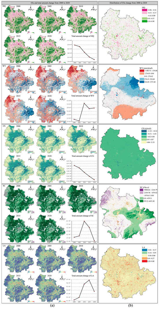 Spatial pattern and evolution of ESs from 2000 to 2020. (a) Spatial pattern of ESs and total amount of change in ESs from 2000 to 2020; (b) spatial distribution of ESs change from 2000 to 2020.