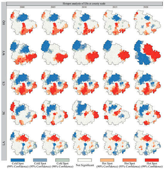 At the county scale, the spatial distribution patterns of the cold and hot spots for ESs are basically consistent with those at the grid scale, but the distribution areas differ significantly. This is primarily manifested in a general decrease in the area of cold and hot spots, accompanied by an increase in area disparities among different services. Additionally, the same service experiences abrupt changes in area over different periods. The area proportions of the hot spot regions are ranked as CS > WY > LA > HQ > SC, while those of the cold spot regions are ranked as CS > SC > WY > HQ > LA (Figure 5b).