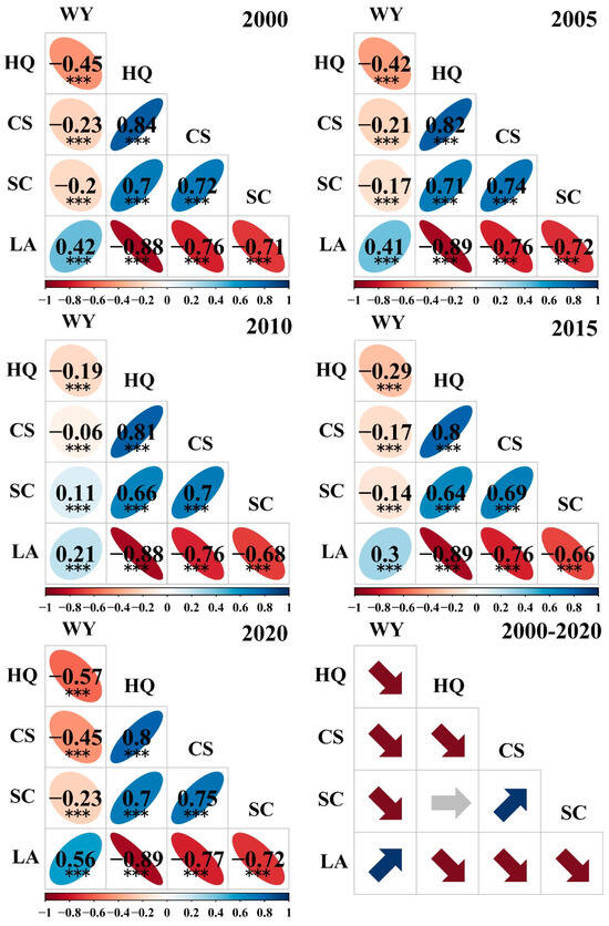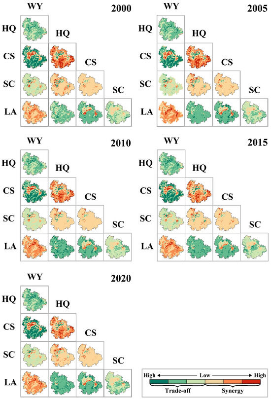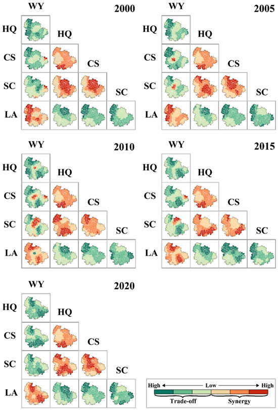 Multiscale analysis is conducive to enhancing the accuracy of assessing the trade-offs and synergies among ESs. This study examined the potential correlations among five ESs in 2000, 2005, 2010, 2015, and 2020 at both the grid and county scales (Figure 6 and Figure 7). Temporally, the interaction strength among most ESs tended to decline around 2010. The relationships between HQ, CS, and SC, as well as between WY and LA, generally maintained high levels of synergy or progressed towards synergy over time. The interaction trends and strengths between WY and other ESs showed significant temporal variability and fluctuations, whereas HQ, CS, SC, and LA exhibited less noticeable changes.