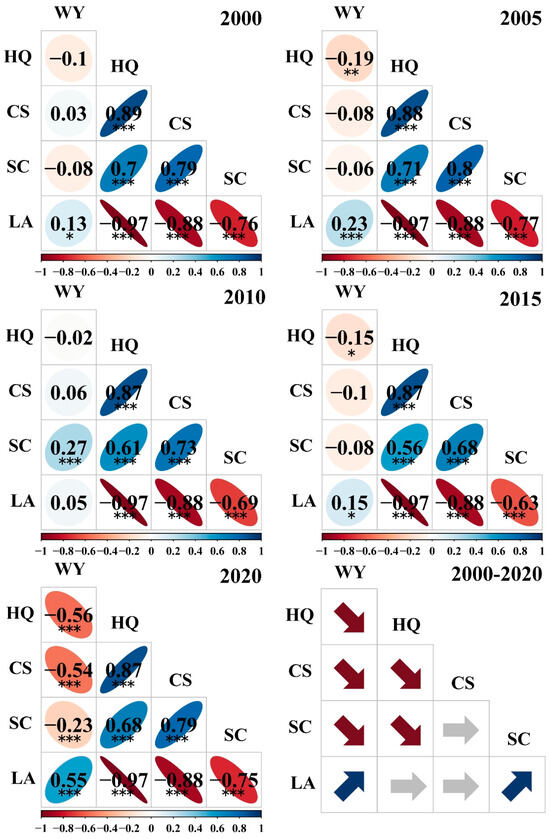Correlation among ES pairs at county scale (* p < 0.05; ** p < 0.01; *** p < 0.001) from 2000 to 2020 and the corresponding changes in correlation (blue arrows denote relationships optimized towards synergy, while red arrows indicate deterioration towards trade-offs).