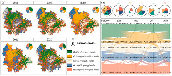 (a) Spatial–temporal patterns of ESBs at the county scale. (b) Composition and relative magnitude of ESs in ESBs at the county scale. Longer segments indicate a higher ES supply. (c) The area of interconversion among different ESBs from 2000–2020 at the county scale.