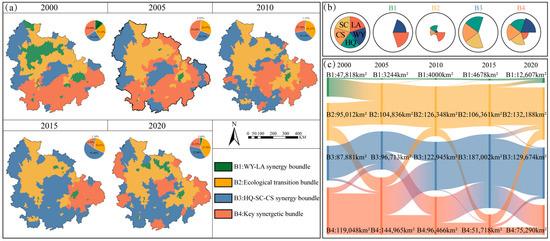 (a) Spatial–temporal patterns of ESBs at the grid scale. (b) Composition and relative magnitude of ESs in ESBs at the grid scale. Longer segments indicate a higher ES supply. (c) The area of interconversion among different ESBs from 2000–2020 at the grid scale.