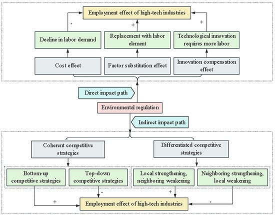 The impact of environmental regulation on employment in high-tech industries is manifested in both direct and indirect effects, as depicted in Figure 1. The direct effects refer to the influence exerted by local governments through the implementation of environmental regulation on local employment. These effects are primarily achieved through the pathways of cost effects, factor substitution effects, and innovation compensation effects.