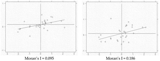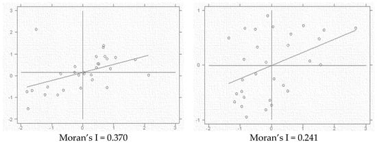 By exploratory spatial data analysis, it is possible to effectively test the spatial correlation between data related to geographic location [65]. Spatial correlation refers to the relationship between observed values of variables and lagged terms of variables, which can effectively reflect the data dependence in terms of spatial location, including global spatial correlation and local spatial correlation. Global spatial autocorrelation can reflect whether the attribute values of neighboring geographic units have agglomeration characteristics. Local spatial autocorrelation is used to describe the similarity degree between a region and its neighbors, which reflects the spatial heterogeneity of attribute values. Generally, the local spatial autocorrelation of attribute values is reflected by plotting the Moran scatter plot. The scatter plot has four quadrants. Quadrants 1, 2, 3, and 4, respectively, represent four spatial agglomeration types, namely high-high agglomeration, low-high agglomeration, low-low agglomeration, and high-low agglomeration, which can reflect high- or low-value spatial agglomeration area.