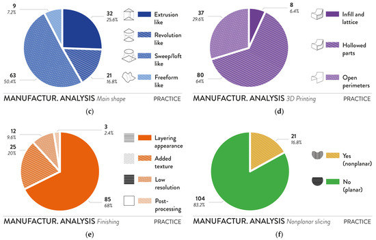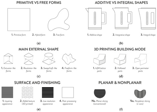 Product analysis of the practical context: formal analysis on (a) primitive vs. freeform shape form-giving approach, and (b) additive vs. integral shape form-giving approach; manufacturability analysis on (c) main external shape, (d) 3D printing building mode, (e) surface appearance and finishing, and (f) planar or nonplanar slicing.