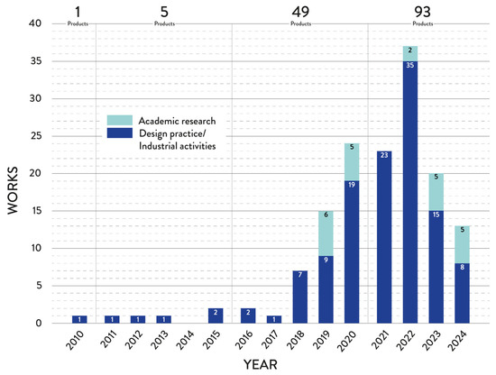 General analysis of the research (light blue) and practical contexts (dark blue) according to the selected case studies (products) per year for the reviewed period (from 2010 to mid-2024).