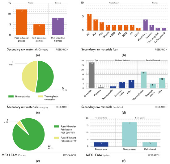 Scraps, secondary raw material, and AM process analysis of the research context: (a) scraps and/or byproduct category; (b) scrap and/or byproduct type; (c) secondary raw material category; (d) secondary raw material feedstock type, with a focus on bio-based and recycled feedstocks; (e) MEX LFAM process; and (f) AM system.