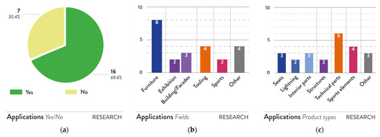 The selected works from the academic research context were then analyzed to understand the possible application fields and product categories considered during the experimental work (Table S3, Supplementary Materials). As shown in Figure 4a, only seven entries focused on materials and AM technologies without working on demo products, whereas more than two-thirds of the publications studied one possible product application at least (16 entries). According to Figure 4b, furniture (eight elements) and tooling (four elements) represent the most studied application fields, followed by the interior design macro-area (five entries), i.e., building or facade elements and exhibitions. In detail, different types of products stand out as typical categories to be explored in the academic research context (Figure 4c), especially technical parts and equipment (10 products), such as sports equipment, e.g., kayak paddles (Figure 5a), household spare parts, and molds [43,61,79]. This fact can be due to the specific materials studied in the different works, such as fiber-reinforced plastics, and the characterization performed to assess their technical properties, e.g., mechanical ones. Furniture products, such as lights (Figure 5b), stools, chairs, or tables (Figure 5c), are also commonly fabricated as proofs-of-concept (nine entries) [67,75,80]. Despite the limited amount of product case studies from academic research, these results confirm the growing interest in detecting new potential fields for secondary raw materials and LFAM processes. The results also highlight the role of research in opening new paths to be exploited in real-world scenarios [34], as well as increasing the Technology Readiness Level (TRL) of these materials and processes to reach the market.