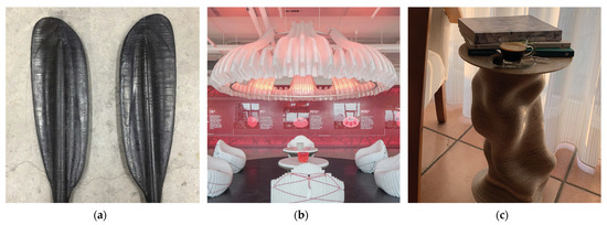 Examples of demo products studied in the experimentations from the research context: (a) kayak paddles made of recycled ABS [43]; (b) “Gathering Chandelier” made in recycled PET [75]; and (c) coffee table made in virgin PLA filled with spent coffee grounds [67].