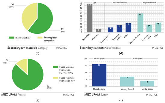Scraps, secondary raw material, and AM process analysis of the practical context: (a) scraps and/or byproduct category; (b) scrap and/or byproduct type; (c) secondary raw material category; (d) secondary raw material feedstock type, with a focus on bio-based and recycled feedstocks; (e) MEX LFAM process; and (f) AM system.