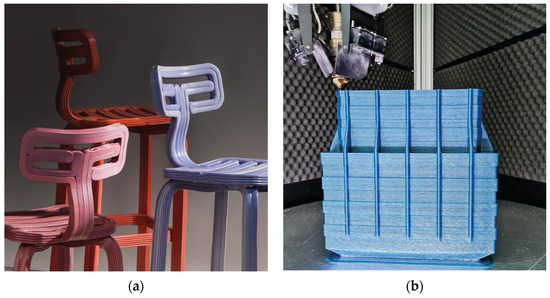 The analysis of the case studies outlined the trends in the application fields and product categories explored using MEX LFAM processes and new secondary raw materials from recycled plastics and biomass waste (Table S8, Supplementary Materials). As from Figure 7a, more than half of the case studies (~60%) relate to the furniture sector, including indoor furniture, urban and outdoor furniture, and furnishing accessories, i.e., vases and lightning elements. Another well-represented macro-area is the interior and architectural design (~25%) that comprehends artifacts for exhibitions, stands, and retail, as well as structural and decorative parts of buildings and facades. Other applications represent around one-tenth of the entries and include technical sectors, i.e., mobility and transportation or tooling, and specific markets, i.e., fashion, toys, and sports. This fact is connected to the increased dimensions, feed, flow rates, and freeform shapes achievable through LFAM, especially with robotic arms. Furthermore, these features fit well with the average scale of the products from the retrieved sectors. In general, the case studies are mostly connected to long-lasting types of products, also with structural constraints. As shown in Figure 7b, almost 80% of the cases relate to the furniture sector, especially seats (~34%), including benches, chairs (Figure 8a), lounge chairs, lightning elements (~15%), or interior parts (~5%), such as lamps and room dividers [81,87,97]. Structures are also a spread typology of products, usually connected with exhibitions, interiors, and architectural design [82,84,98]. Parts for other sectors represent only ~6% of the case studies (8 products), usually connected with transportation, e.g., boat components [96,98] or toys [84,99]. According to the analysis, these case studies are mostly linked to small production batches, e.g., stool series (Figure 8b) [87], or even almost unique parts, such as design explorations from studios [44,46], leading to customized outcomes in terms of materials and geometries. Nevertheless, these practices contribute to legitimizing the role of MEX LFAM in fostering circular economy practices by creating new market niches and spreading these products to different user audiences.