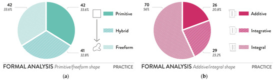 The formal analysis investigated the form generation approaches used by companies or studios (Figure 1a,b), reported in Table S9 (Supplementary Materials). On the one side, primitive, hybrid, and freeform approaches are equally adopted in practical contexts (Figure 9a), showing a significant commitment to exploring all the different shape opportunities enabled by AM. On the other side, integral approaches are mostly used for products, representing ~56% of the cases, according to Figure 9b. In general, this fact is consistent with the use of AM to achieve complex geometries and part integration, reducing the assembled components in a product and including them in its overall shape [51]. Focusing on the specific companies and product typologies, three main trends can be highlighted in using the different form-giving approaches: (a) artifacts with a freeform and integral shape (32 products), (b) objects with a primitive and integral form (24 products), and (c) parts with mixed approaches. The former group is strictly connected to the formal possibilities enabled by AM technology, which allows designing organic and complex shapes in a single step, e.g., part integration. Hence, the multiple functions of products are incorporated in a single main shape, which predominates over the others. Light elements and seats mainly follow this trend in formal languages, such as Stratum (The New Raw) [45], Elemental (Post Industrial Crafts) [89], or Nital (Nagami) [44]. For instance, it is possible to incorporate the seating area, the back, and the legs in the main shape of a chair. Moreover, these products mainly exploit well-established secondary raw materials for AM, such as recycled commodity thermoplastics [44,45]. Primitive and integral forms of the second group are also linked to the capability of AM to integrate different parts in one component, especially for tables and lightning, e.g., Pixel brick (Aectual) [97], Amphora (Model N°) [85], or Alp round (Lowpoly) [84]. This formal combination is often combined with secondary raw materials from less conventional scraps or byproducts, such as thermoplastic-based composites or biomass scraps, e.g., drink bricks or coffee scraps [84,97]. In addition, some products adopt mixed options, e.g., hybrid and integrative or hybrid and integral, whereas additive approaches are less used combined to freeform shapes. Dealing with bigger dimensions, volumes, and weights, the additive approach for products from LFAM means assembling different components or manufacturing parts with challenging features for large-format 3D printing, i.e., overhangs.