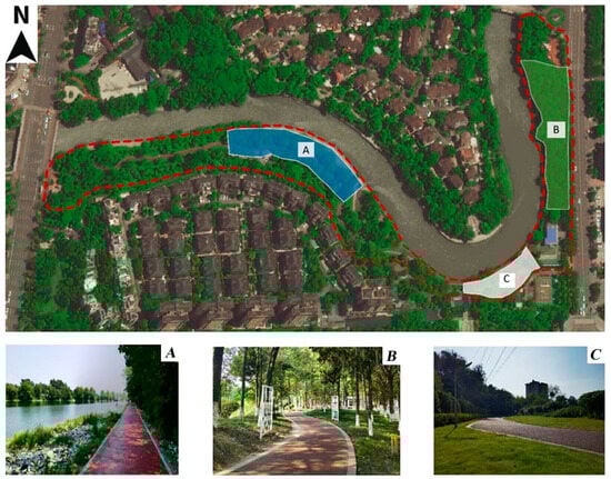 Therefore, the final location of the experiment was set as the Nancheng Nanxun Avenue Greenway (NAG) in Wenjiang District, Chengdu City. Through this experimental research, it can be seen that the greenway is in the center of the city, accompanied by the Jiang’ an River, with a total length of about 11 km; rich in landscape; surrounded by many commercial buildings and neighborhoods; with a wide variety of plant species and relatively dense; a hydrophilic waterfront barge; clean and natural water features; and a relatively high frequency of usage. Therefore, this choice also has some real-life significance (Figure 1).