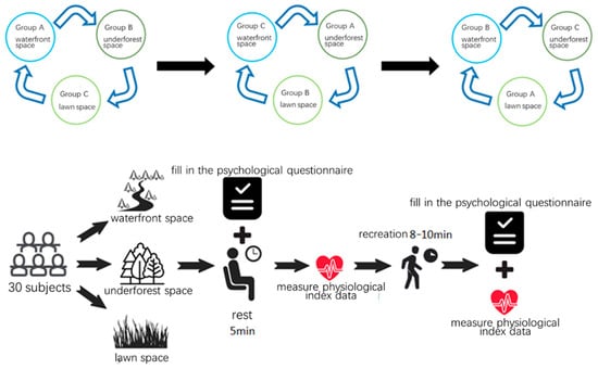 The experiment was selected to take place in early November 2021, and was conducted over four days, all of which were sunny, with temperatures ranging from 15 to 23 °C, consistent with human comfort temperatures, and with average daily stability and moderate variability of <10%. The same experimental time (10:00 a.m.−12:00 p.m.) was chosen for the four days of the experiment, and the two experiments were separated by one day as a way to minimize the effects due to the daily variation of the volunteers’ physiological rhythms. Thirty volunteers were randomly divided into 6 groups of 5 people each, marked by groups 1–6. On the first day, groups 1, 2, and 3 conducted experiments on the NAG, and groups 1–3 conducted the first round of experiments in the waterfront space, forested space, and lawn space in the same order; when the first round of experiments was over, they changed the space in the same order for the second round, and after the second round was over, they also carried out the third round in the same way (Figure 2). Similarly, the next day, group 4, group 5, and group 6 went to the NAG to conduct the experiment. The site staff informed the volunteers of the purpose and requirements of this experiment in advance, in order to avoid invalid experimental data.