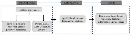 SPSS 21.0 software (IBM, Armonk, NY, USA) was used to analyze the physiological and psychological data of the subjects in the waterfront, underwood, and lawn spaces of the greenway by mean value analysis, Shapiro–Wilk normal distribution test, and paired samples t-test to analyze the physiological and psychological recovery effects of the volunteers in each space and compare them to explore the differences in the physiological and psychological recovery effects of the different spaces of the greenway. The evaluation table of restorative environmental factors in each space was analyzed, and the causal relationship between each restorative environmental factor and human stress release in each space was explored through mean value analysis, correlation analysis, and linear regression analysis (Figure 4).