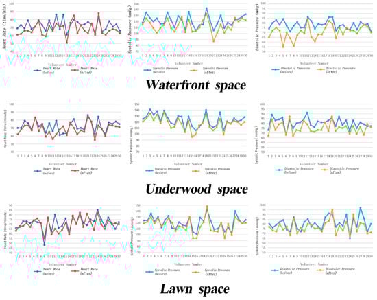 Heart rate can reflect people’s tension level to a certain extent. The mean heart rate of the subjects after recreation in the three spaces of the greenway decreased by a certain amount compared with that before recreation. The average decrease in heart rate in each space was 3.61 beats/minute. It can be seen that recreation in the three different spaces of the greenway can make the human body feel relaxed and calm to a certain extent. However, compared to the lawn space, the waterfront space and the underwood space were more relaxing and calming. In terms of blood pressure, the mean systolic and diastolic blood pressures after recreation changed to a certain extent compared with those before recreation. The average decrease in systolic blood pressure and diastolic blood pressure in each space was 5.71 mmHg and 5.57 mmHg, among which the systolic blood pressure and diastolic blood pressure data before and after recreation in the waterfront space and the underwood space were significantly reduced, while the systolic blood pressure and diastolic blood pressure data in the lawn space had a certain slight decrease, which shows that the same waterfront space and the underwood space are more capable of relaxing and calming the human being (Table 5).