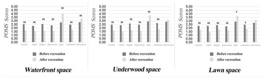 Comparison of POMS scores before and after recreation (* p < 0.05, ** p < 0.01).