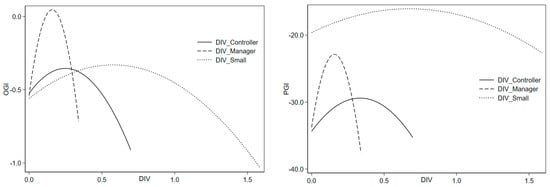 The coefficients α1 and α2 are the focus of this paper. If the estimated α1 is positive and α2 is negative and both are statistically significant, this suggests an inverted U-shaped relationship between DIV and PGI (OGI). Based on Haans [], this article also uses the U-test in the “Baseline regression” section to test and determine the sign and significance of the slopes of α1 + 2α2DIVL and α1 + 2α2DIVH, whether the turning points are within the confidence intervals or not, and to further determine whether or not an inverted U-curve relationship exists between DIV and PGI (OGI).