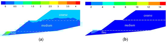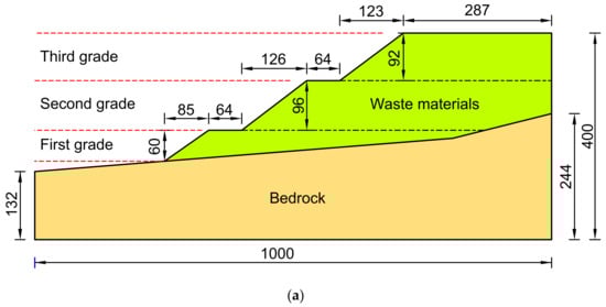 Figure 2 shows the two generalized models. Covered construction and downslope construction are two common types of dumping methods in engineering practice; thus, these two methods were used for mine waste dumps in primary base friction tests. In the process of design and application of an open-pit dump, in order to make full use of space to discharge soil, so as to solve the cost problem. Under the premise of ensuring safety, different inclines of the dump were designed and implemented. Different slope pairs will lead to different load-bearing capacities, so it is necessary to design and study a variety of slope angles of the step design. The model of the covered construction dump includes the following parameters (Figure 2a): the first-grade slope ‘s ratio is 1:1.4 and is 60 mm high, the second-grade slope‘s ratio is 1:1.3 and is 96 mm high, and the third-grade slope‘s ratio is 1:1.3 and is 92 mm high. The downslope construction dump model parameters are as follows (Figure 2b): the first-grade slope‘s ratio is 1:1.75 and is 128 mm high, the second-grade slope‘s ratio is 1:1.75 and is 65 mm high, and the third-grade slope‘s ratio is 1:1.75 and is 65 mm high.