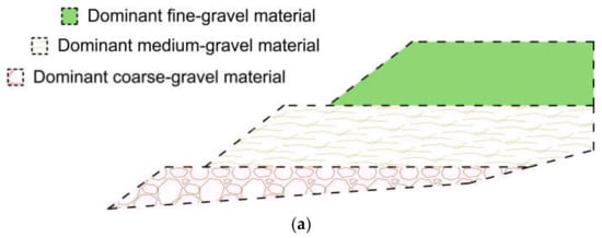 Since the size and spatial distribution of waste rock materials are important factors affecting layouts of mine waste dumps, three different sizes of gravel, i.e., fine-gravel, medium-gravel, and coarse-gravel, were taken into consideration, and thus four comparative models were constructed by altering combinations of waste materials. All the models in this study have their properties shown in Figure 3. We built four models, conducted base friction experimental tests, and recorded the failure behavior and related parameters. Model A1 indicates that the covered construction waste dump was stacked in an idealized sequence (Figure 3a), in which the dominant coarse-grained gravels were at a first-grade stage and the dominant fine-grained gravels were at a higher-grade stage. Model A2 indicates that the covered construction waste dump was stacked in a common sequence (Figure 3b), in which the first-grade stage was composed of dominant fine-grained gravels and the higher-grade stage was composed of dominant coarse-grained gravels. Model B1 indicates that the downslope construction waste dump was stacked in a common sequence (Figure 3c), in which dominant fine-grained gravels were placed at the inside of the dump while dominant coarse-grained gravels were placed at the outside of the dump. Model B2 indicates that the downslope construction waste dump was stacked in an idealized sequence (Figure 3d), in which dominant coarse-grained gravels were placed at the inside of the dump and dominant fine-grained gravels were placed at the outside of the dump.