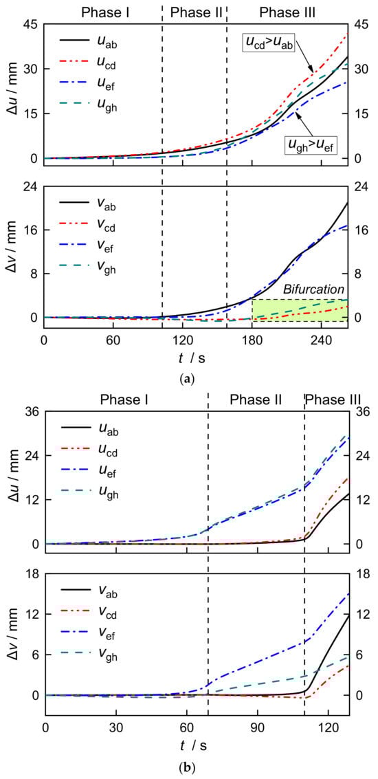 The histories of point couples moving relative to each other in waste dump models are shown in Figure 15, where Δu and Δv are horizontal and vertical relative range, respectively; the subscripts u and v represent the number of monitoring points i and j, respectively. Openings in directions that can be seen both horizontally and vertically have a positive relative displacement definition.