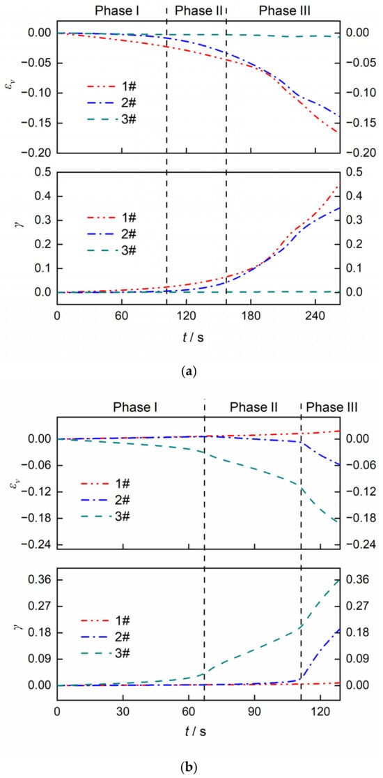 The strains’ behavior can serve as a preliminary explanation for the three stages of point couples’ displacement on the slope during tests, as shown in Figure 16. At the beginning of the tests, in Phase I, the volumetric strain of the elements was evenly distributed larger than the maximum shear strain (e.g., element 1# in Models A1 and B1 in Figure 16a and Figure 16c, respectively). Since the strains of the three elements— the volumetric strain and maximum shear strain—were not as large as they should have been, it can be concluded that the dominant volumetric strain caused a small displacement during the first phase. In addition, the volumetric strain was negative; indications suggest that the dilative horizontal strain was greater in magnitude than the compressive vertical strain at that particular location. In Phase II, the initial increase during loading was followed by a greater rate of increase for both the maximum shear strain and the volumetric strain of the elements (Figure 16); this induced deformation due to the coupled compression and shear effect, which was more significant. Therefore, a significant increase was observed in the displacement of the element. After the maximum shear strain reached a significant magnitude, slippage occurred across this element and eventually formed a local collapse. With the belt running continuously in Phase III, the elements experienced a significant increase in their maximum shear strain, which was significantly larger than their volumetric strain. The rate of displacement increased during the tests, leading to the slide body separating and sliding down along the failure surface, which was demonstrated by this. Note that the strains of element 2# in Model B2 (Figure 16d) experienced minor fluctuations during Phase III, and then the volumetric strain was positive, which was distinct from the dilatory volumetric strain of conventional elements in other regions. This indicated that in the process of initial cracks extending through the upward dominant medium-gravel material stage to form composite multistage failure, an approximate vertical shear band appeared in that location.
