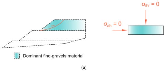The failure modes of waste dumps are primarily dependent on the dump’s shape, as indicated by the above analysis. The qualities of waste materials can be impacted by the layout and strength of the dominant fine-gravel material, which makes it even more remarkable. Hence, a simplified continuum mechanical interpretation of the behavior of the dominant fine-gravel material was also illustrated in Figure 19. The dominant fine-gravel layer was simplified as a rectangular box and analogically analyzed by the triaxial compression failure of rock samples. Thus, the box is flat for covered waste dumps, but for downslope waste dumps, the box should be tilted, which is shown upright here for ease of understanding. When the box is placed as the inner side layer of a downslope waste dump (Figure 19c), lateral confining pressure (σah) would be given by the outer side layers, and thus the box would be invulnerable to failure under the confining effect. Similarly, when the box is placed as the bottom layer of a covered waste dump (Figure 19b), additional vertical pressure (σav) would be generated by the upper overburden layers, which makes the box overload and vulnerable to failure. Particularly in Model B2 (Figure 19d), with the damage of the box, the support for the adjacent layer was rapidly weakened, and the adjacent layer was quickly destroyed, thus resulting in the composite overall slip. The total area of the sliding bodies in Model B2 was the largest among the four models, and the damage was therefore the most severe.