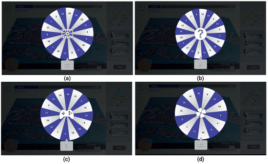 During each turn, the players spin a wheel that generates a random number corresponding to an activity, such as a question, a mini-game related to flooding, or a video question (Figure 2). These activities (Figure 2a–c) impose a penalty, in case of failure to pass the test (wrong answer or game over of a mini-game). If failed, a rise in sea level proportional to the difficulty of the activity will occur. However, the possibility of obtaining a bonus (Figure 2d) keeps the score unchanged by allowing the player to skip the turn. Each spin eliminates previously drawn numbers to prevent repetition, ensuring the game ends once all numbers have been drawn.