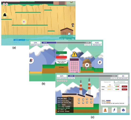 Snapshots of the three mini-games: (a) escaping from the rising sea level; (b) the mayor of a coastal city making decisions to preserve the coast over time; (c) a family business facing its carbon footprint affecting SLR.