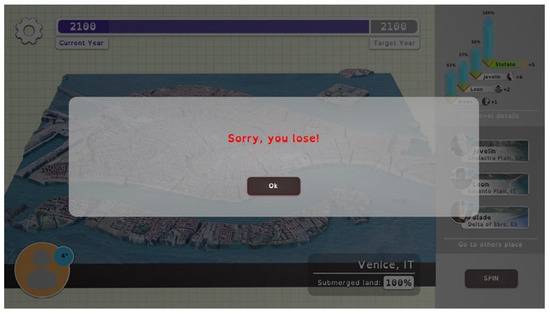 Three mini-games suggest different aspects of the SLR (Figure 4) and involve navigating paths or making choices that determine success within a set time. In two of them, the flooding theme is represented by water rising on the game board until it covers it completely. Virtual players are automatically and randomly assigned scores for each turn. At the end of the game, the real player is informed of the outcome (defeat or victory, Figure 5).