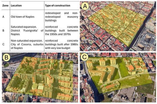 Example of (A) old town zone, (B) saturated expansion zone, and (C) non-saturated expansion zone for the Mediterranean context, in detail in the city of Naples.