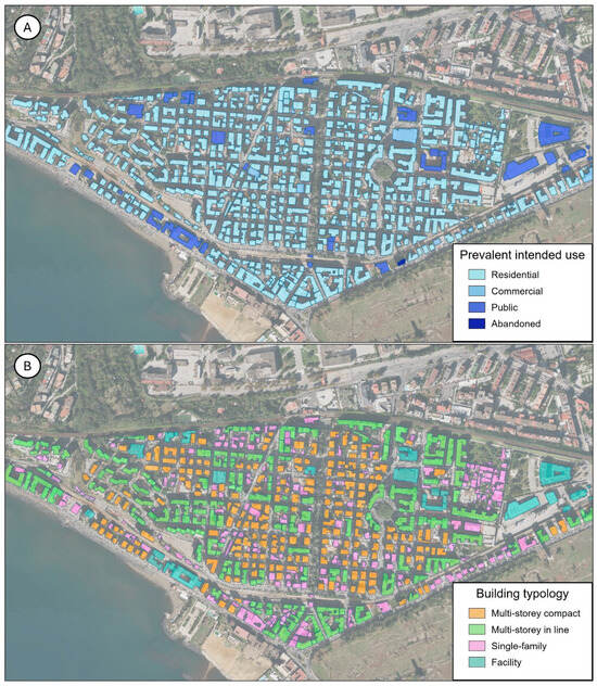 (A) Prevalent intended use for the analyzed district buildings; (B) building typologies in the district.