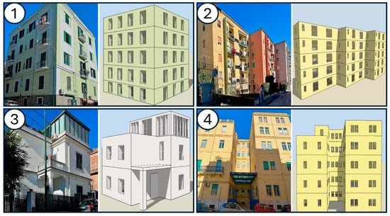 Buildings archetypes: on the left the considered existing buildings, and on the right the building models. (1) Multi-story compact building unit; (2) multi-story building units, in line; (3) single-family isolated building unit; (4) facility and tertiary sector.