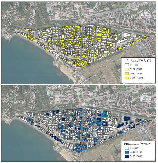 From the total energy requirement of buildings, it is then possible to understand, through an analysis of the potential renewable sources that can be installed, how it is possible to integrate a renewable rate to cover part or all the energy demand of buildings. The results can be viewed through urban energy maps (UEM), which can be created in the QGIS environment. These maps provide a complete and informed overview of an urban area’s energy dynamics, thus facilitating energy planning, environmental performance assessment, and the formulation of sustainability strategies.