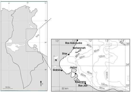 - Ben Abdallah, A.; Ben Mustapha, K. Marine Biodiversity in the Gulf of Gabès (Tunisia): Impact of Human Activities and Management Strategies. Cah. Biol. Mar. 2011, 52, 401–412. [Google Scholar]
