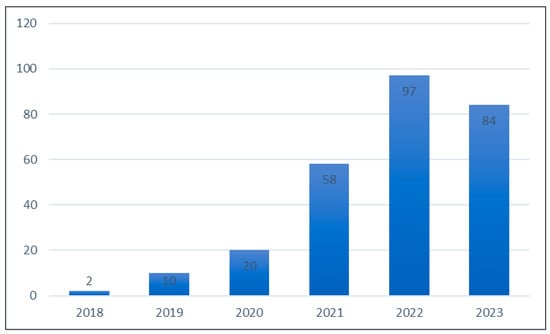 We performed the same searches on Web of Science, which also indicated an increase in the number of publications related to “blockchain” and “circular economy” in recent years. However, in 2022, there were slightly more publications than in 2023. Our results are shown in Figure 5.
