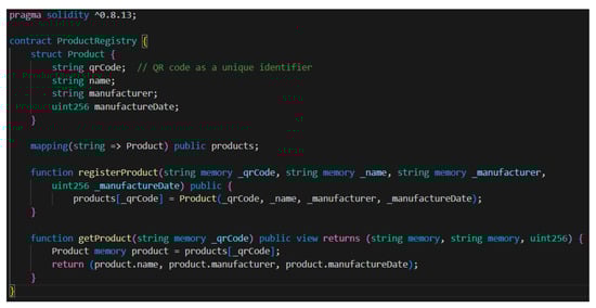 Figure 11. An example of a smart contract used in Solidity to register products.
