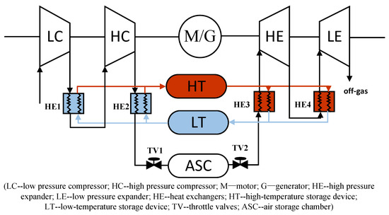 The main components of an AA-CAES system include compressors, expanders, air storage chambers, heat exchangers, and a temperature storage device, as shown in Figure 2. During the energy storage phase, the AA-CAES system harnesses electricity generated from renewable sources to drive compressors that compress air into a high-pressure, high-temperature gas. This gas then enters a heat exchanger to undergo thermal moderation with a heat transfer medium, resulting in a cooled high-pressure gas that is stored within air storage chambers; simultaneously, the heat medium, now carrying the absorbed heat, is directed into thermal storage tanks to store the thermal energy. During energy release, the high-pressure, cooled gas from the storage chambers is released and enters a heat exchanger to conduct thermal exchange with heat released from the thermal storage tanks, creating high-pressure, high-temperature gas that powers expanders to generate electricity, which is subsequently vented into the atmosphere.