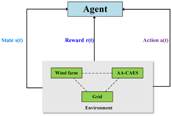 Due to the inherent randomness and uncertainty of wind energy, it is challenging to establish a specific and accurate mathematical model for the source–storage–grid optimization decision process. As a result, we achieve a tiered scheduling optimization strategy by utilizing a model-free, data-driven deep reinforcement learning method. We transform the energy scheduling issue of AA-CAES as a Markov decision process (MDP) and gather relevant data from various parts of the system in a data-driven manner. The state space consists of the states of each model within the source-storage-grid. We derive the optimal scheduling strategy through the iterative process of states and actions, guided by the reward values from the interactions between the agent and the environment. Figure 4 illustrates the agent process between an intelligent body and its environment.