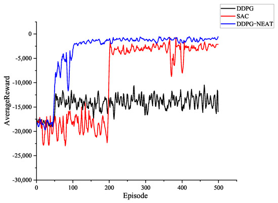 To ensure accurate and reliable comparisons, the same parameter conditions are set to demonstrate the differing performances of three distinct DRL algorithms. For the DDPG algorithm, the learning rate is set to 0.001, the discount factor to 0.99, and BATCH-SIZE to 128. In the NEAT algorithm, the population size is set to 200, and the number of generations to 10. More detailed hyper–parameters are shown in Table 1 and the neural network parameters are shown in Table 2.