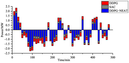 Figure 8 illustrates the charge–discharge status of the CAES at different time intervals of 10 min. The CAES system stores the excess electrical energy generated by the wind farm when its output power exceeds the dispatching power, particularly during the 10–40 min interval. Conversely, when the output power of the wind farm falls below the dispatching power, for example, during the 50–170 min and 190–220 min intervals, and cannot satisfy the dispatching power requirements, the CAES discharges to compensate for the deficiency in electrical energy, thus adhering to dispatching instructions. The results show that, while the various algorithms are effective in managing scheduling, they produce very different scheduling results. Optimization algorithms strive to align the charging and discharging levels of the energy storage system with the surplus or deficit of power (i.e., the difference between the output power of the wind farm and the dispatching power), signifying a more precise and reliable dispatching strategy. For instance, at the 20 min mark, the output power of the wind farm exceeds the dispatching command by approximately 1.7 MW. From Figure 8, the charging power of the DDPG algorithm is roughly 2.34 MW, the charging power of the SAC algorithm is about 1.98 MW, and the charging power of the DDPG-NEAT algorithm is nearly 1.78 MW. At the 100 min mark, the output power of the wind farm is approximately 1.64 MW lower than the dispatching instruction. The discharging power for the DDPG algorithm is around 2.18 MW, for the SAC algorithm is about 1.81 MW, and for the DDPG-NEAT algorithm is approximately 1.7 MW.